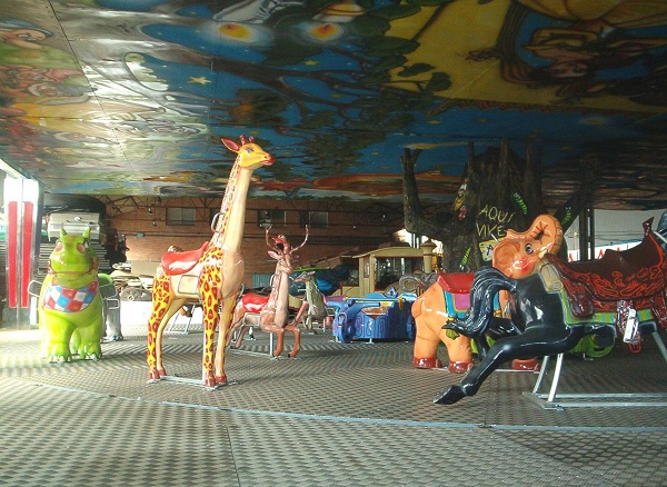 Dimensiones: 12 X 12 metros Figuras: 15 de animales y coches 58 plazas Plataforma de aluminio Decoracion en poliéster Potencia: 3 kw Alumbrado: 6 kw Fabricacion:2003